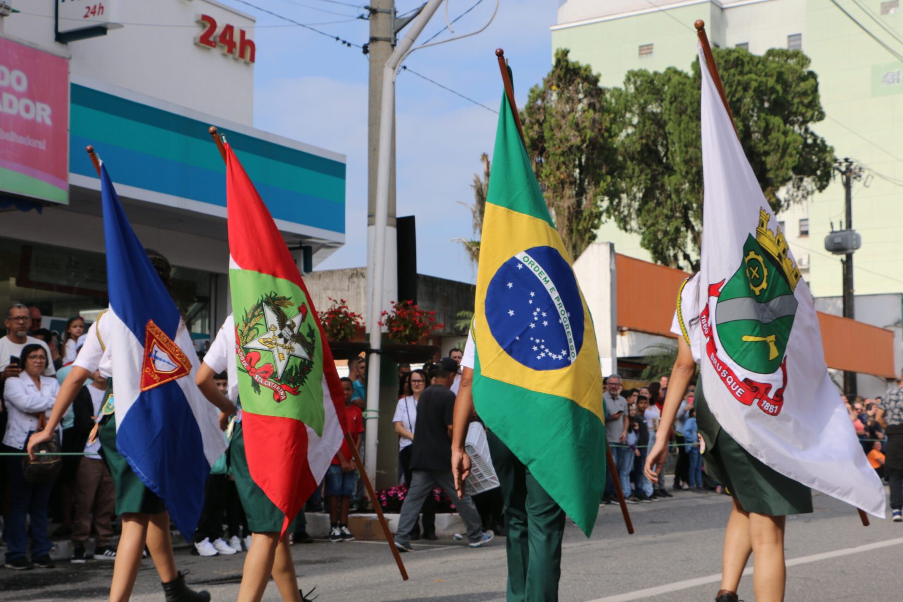 Antes do desfile iniciar, o ato solene contou com a presença de diversas autoridades. O hino nacional ficou por conta dos servidores da Secretaria de Educação, Marcelo Jacob Júnior. Já o hino de Brusque, foi cantado por Maria Luiza Ferreira Cabral, aluna da Rede Municipal.