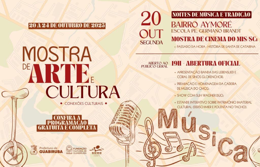 De 20 a 24 de outubro, Guabiruba recebe a Mostra de Arte e Cultura 2025, que neste ano tem como tema “Conexões Culturais”. A programação gratuita e itinerante levará arte, criatividade e tradição a diferentes bairros do município, fortalecendo os laços entre artistas, comunidade e poder público.