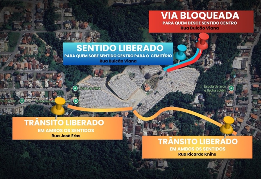 Para melhorar a fluidez do tráfego e evitar congestionamentos, será proibido estacionar nas vias próximas ao cemitério. A Setram instalará placas de sinalização nas ruas Bulcão Viana, Ricardo Knihs e José Erbs, e a fiscalização contará com o acompanhamento da Guarda de Trânsito de Brusque (GTB).