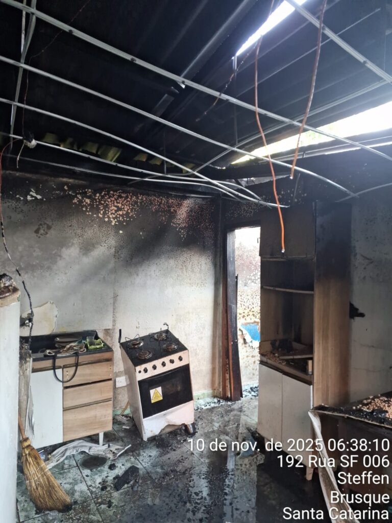O Corpo de Bombeiros foi acionado para um incêndio em residência no bairro Steffen, por volta das 5h30 da madrugada desta segunda-feira, 10.