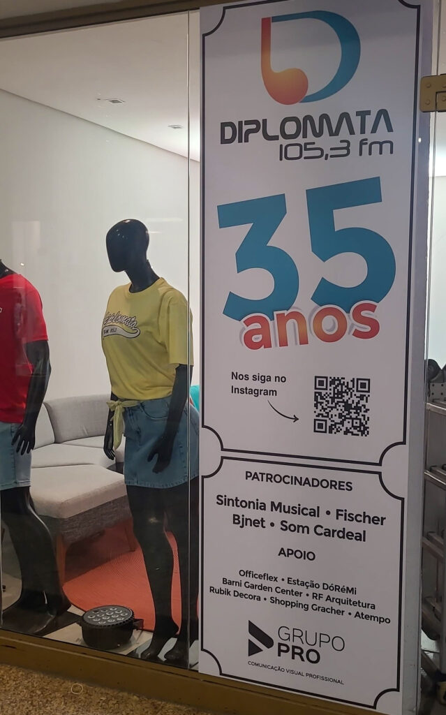 No próximo dia 15 de novembro, a rádio Diplomata FM completa 35 anos. Para comemorar o marco, a emissora terá uma semana muito especial. O Estúdio 2 foi montado no Shopping Gracher, no Centro de Brusque, e a programação será transmitida do local nos seguintes horários: de segunda-feira, 10, a quinta-feira, 13, das 14h às 17h55. E sexta-feira, 14, das 7h ás 19h.
