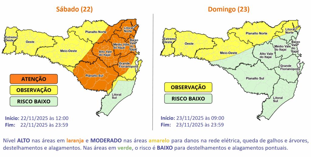 O risco é moderado a alto para ocorrências relacionadas a destelhamentos, danos na rede elétrica, queda de galhos e árvores, além de alagamentos pontuais.
