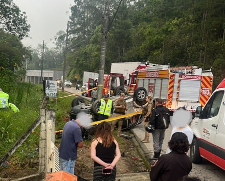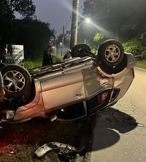 Imagens do local mostram um automóvel capotado, com as rodas para cima, e várias pessoas próximas ao local da ocorrência. As circunstâncias do acidente ainda serão investigadas.