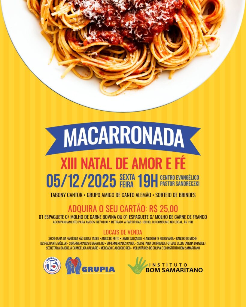 O Grupo de Proteção da Infância e Adolescência (GRUPIA), em parceria com o Instituto Bom Samaritano, realiza no dia 5 de dezembro, a tradicional Macarronada Beneficente, que abre oficialmente a programação do XIII Natal de Amor e Fé. Neste ano, o evento acontecerá em novo endereço: o Centro Evangélico Pastor Sandreczki, no Centro de Brusque, a partir das 19h.