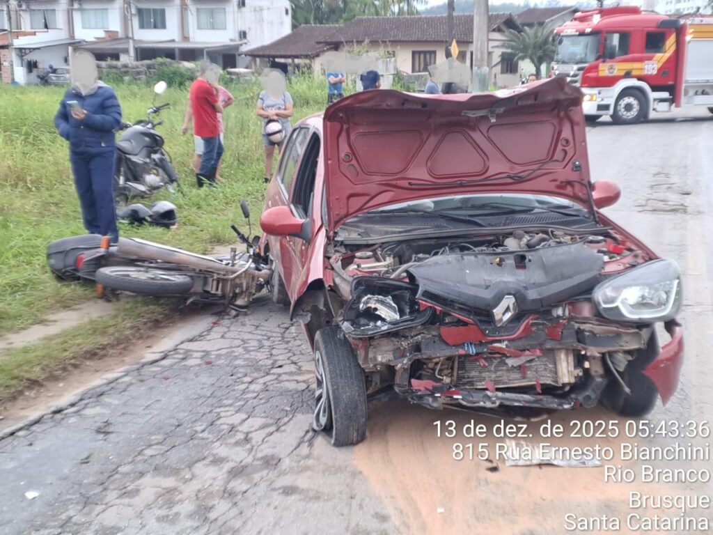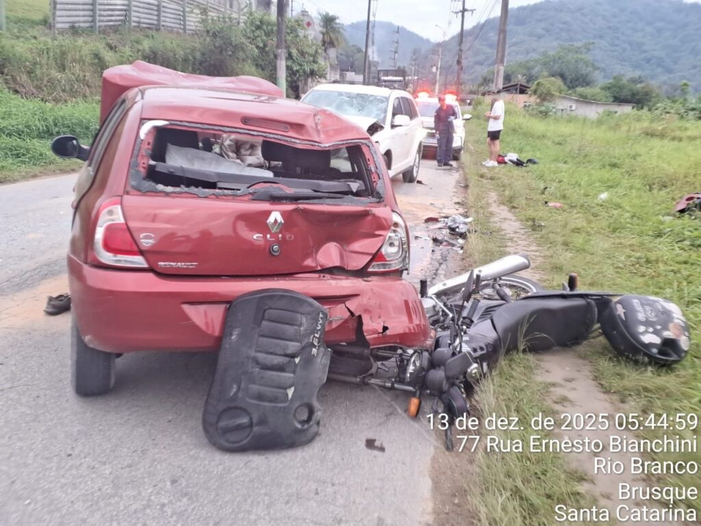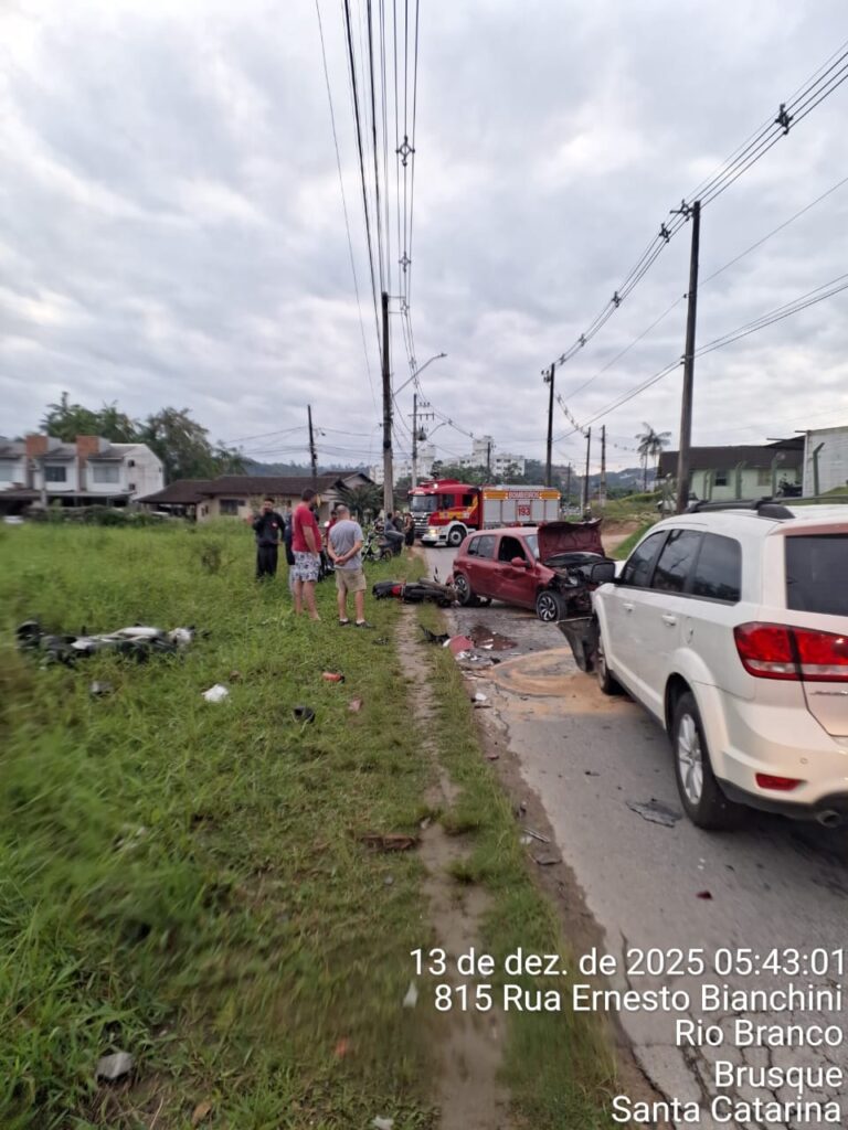 Uma colisão envolvendo quatro veículos mobilizou equipes do Corpo de Bombeiros, SAMU e Polícia Militar na madrugada deste sábado (13), por volta das 5h, na Rua Ernesto Bianchini, no bairro Rio Branco, em Brusque. A ocorrência teve, inicialmente, informação de incêndio em um dos automóveis, o que não se confirmou.