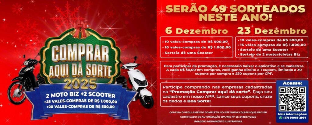 A promoção Comprar Aqui dá Sorte 2025 é uma realização da CDL Brusque, com patrocínio de Sicoob MaxiCrédito; Kohler Joalheria e Ótica; Sindilojas; Aradefe Malhas; Veolia; Mega Motos, Lemus Calçados e Aqui é 10.
