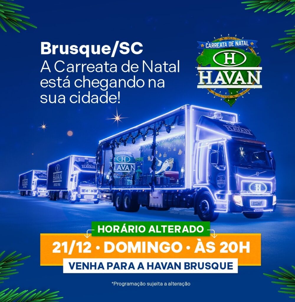 A Carreata de Natal da Havan, que acontece amanhã em Brusque, terá alteração no horário. De acordo com a organização, os caminhões natalinos devem chegar à megaloja por volta das 20h.