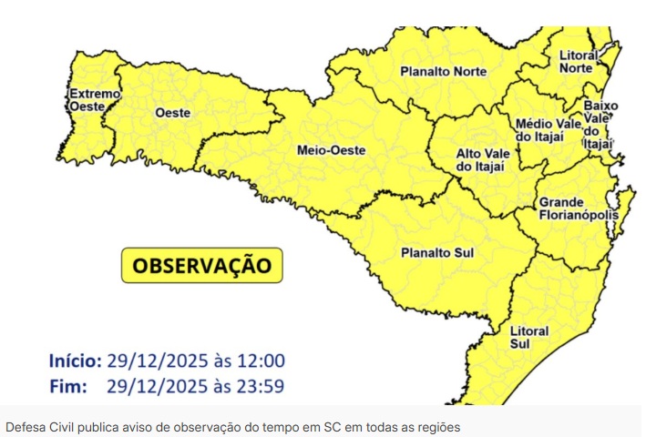 A Defesa Civil de Santa Catarina emitiu um aviso de observação para a tarde e noite desta segunda-feira (29) devido à previsão de calor intenso e risco de temporais em todas as regiões do estado.