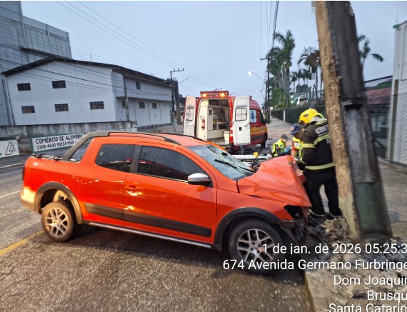 De acordo com o 3º Batalhão de Bombeiros Militar (3º/3º BBM), as guarnições das viaturas ASU-553 e ABTR-114, do Corpo de Bombeiros de Brusque, foram acionadas para atender uma colisão entre um veículo de passeio e um poste, em via pública. No local, foi constatado que um VW Saveiro Cross, de cor laranja e placa padrão Mercosul, colidiu frontalmente contra a estrutura.