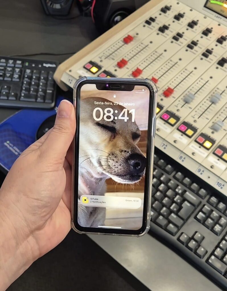 No visor, há uma foto de uma cachorro caramelo e capinha transparente.