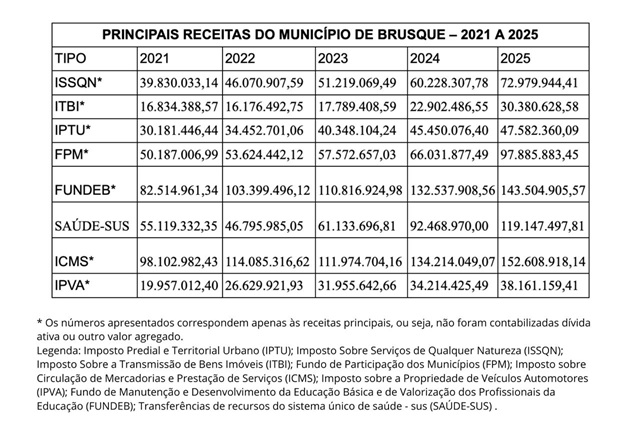 Estudo analisa a evolução das principais receitas do município de Brusque entre os anos de 2021 e 2025