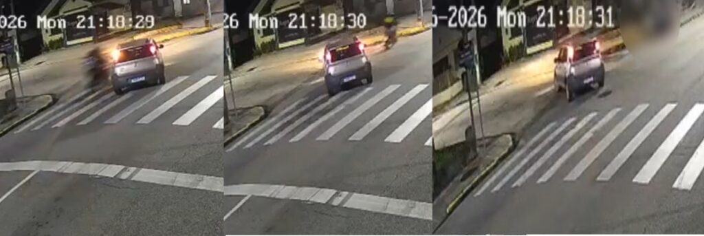 Imagens de videomonitoramento mostram que o carro estava parado no semáforo. Quando o sinal abriu, o condutor iniciou conversão à esquerda para acessar a rua Benjamin Constant. No momento da manobra, a motocicleta, que seguia pela faixa da esquerda, acabou colidindo com o veículo.