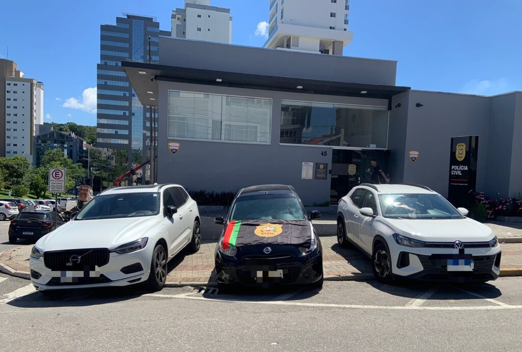 Durante o cumprimento das medidas judiciais, os policiais civis apreenderam três veículos, que, conforme apurado nas investigações, eram utilizados por investigados, embora estivessem registrados formalmente em nome de terceiros, circunstância que pode indicar tentativa de ocultação patrimonial.