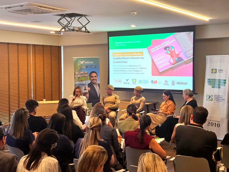 Brusque recebeu, nesta quinta-feira, 23 de abril de 2026, o lançamento da cartilha “Violência contra a mulher, assédio moral e sexual nos condomínios”, uma iniciativa voltada à conscientização, prevenção e orientação sobre esse tipo de crime em ambientes residenciais. O evento foi realizado no Bella Vista Empresarial e reuniu representantes de diversas entidades e instituições.